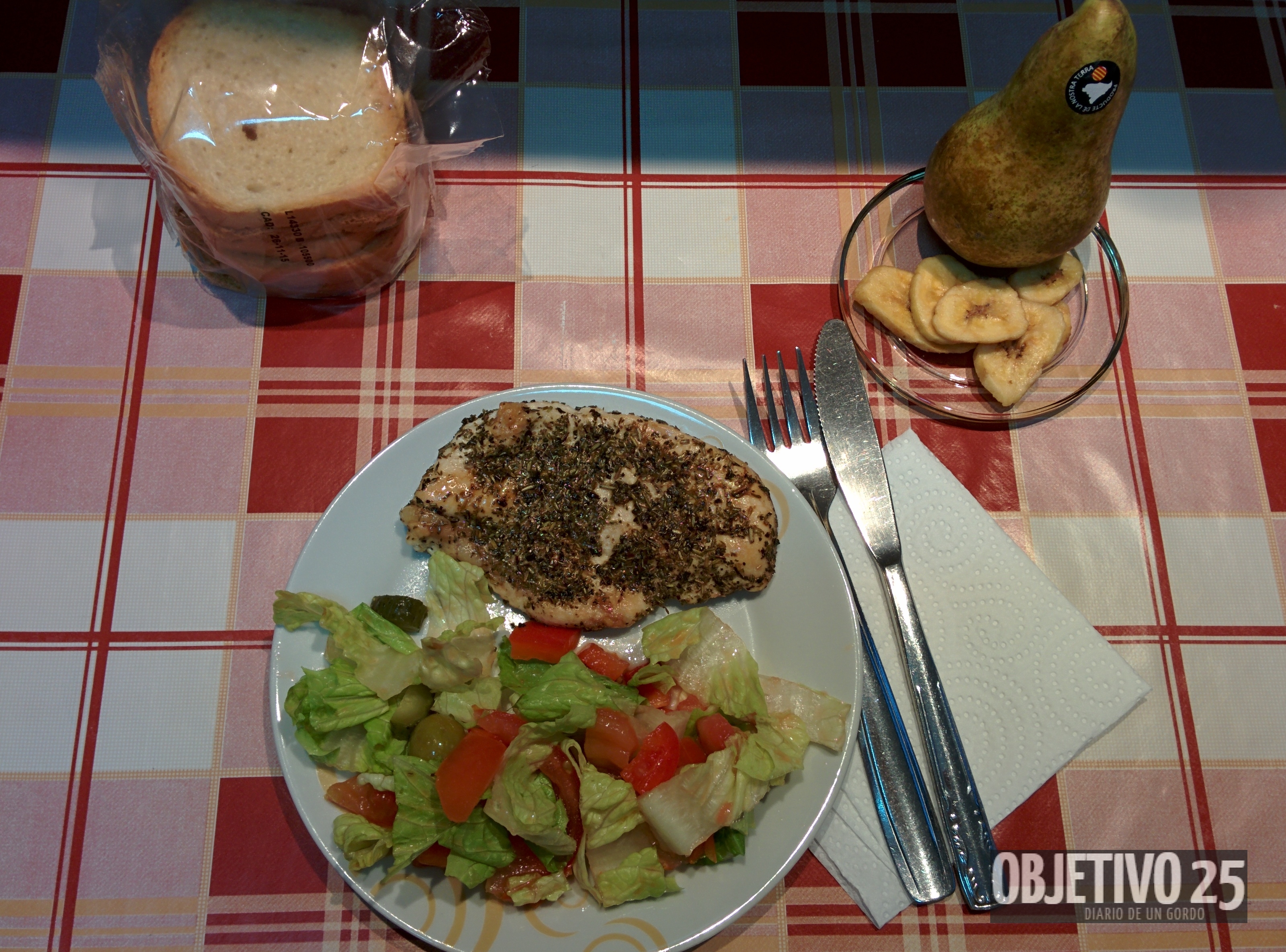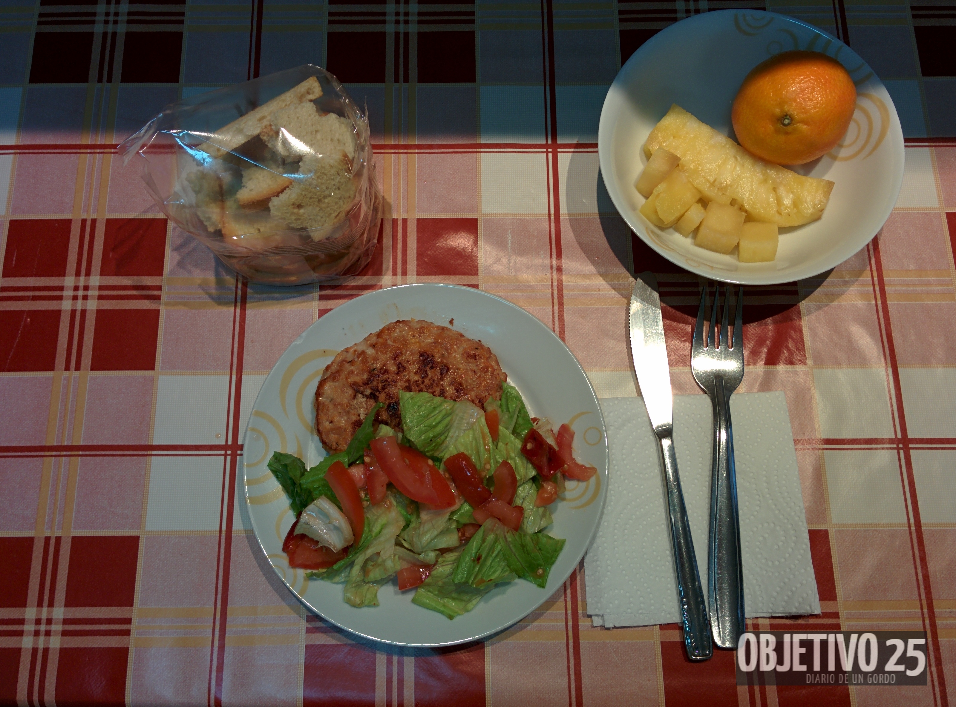 Aprovechando que me acordé el lunes por la noche de sacarla del congelador el martes al mediodía tocó hamburguesa de pollo. La hamburguesa es casera, hace unas semanas hice unas cuantas y las congelé para ir sacando. Acompañada con la ensalada sencilla y de postre un poco de piña y una mandarina.